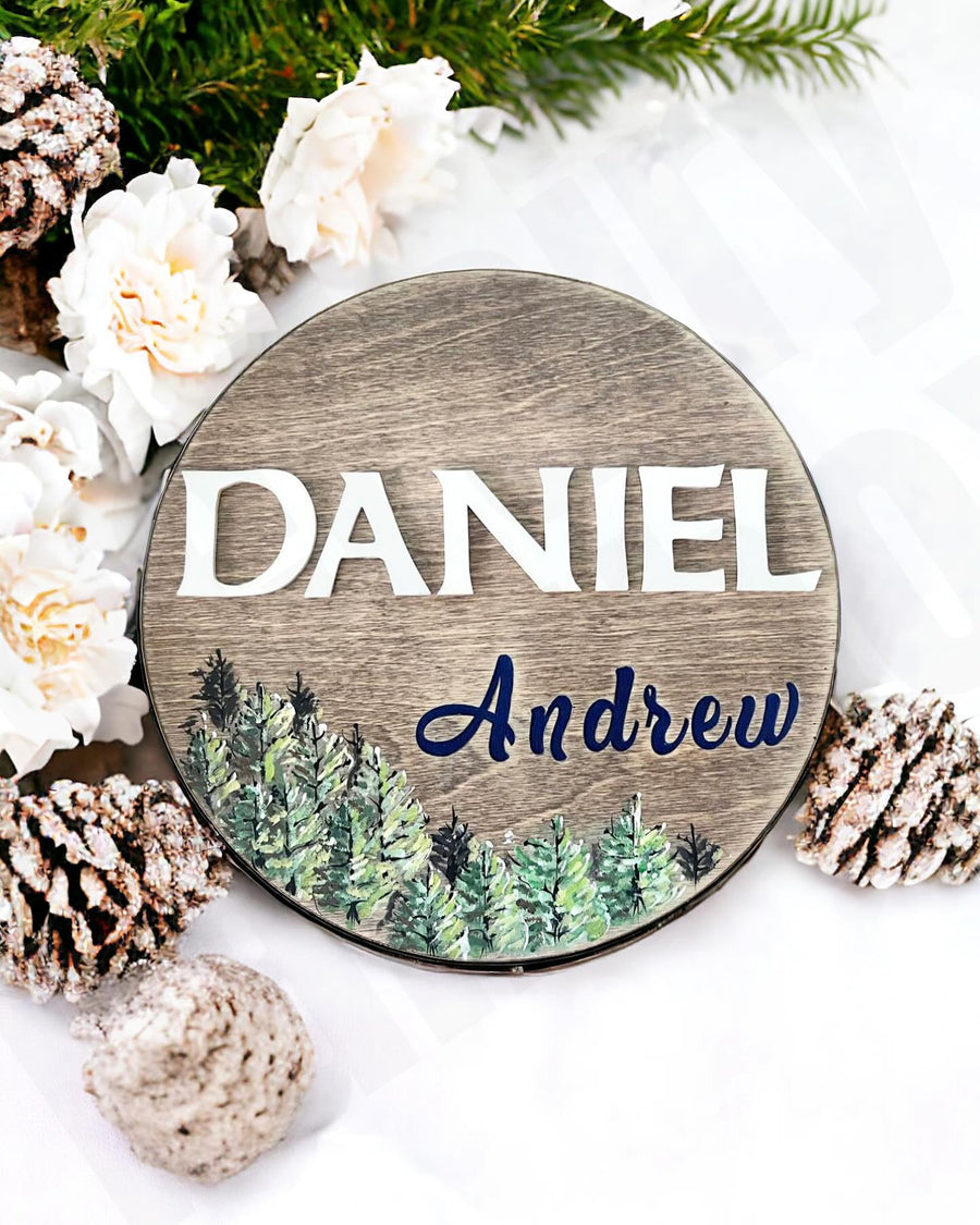 Made from a 1/2" thick wooden disc at 12 inches in diameter, this baby name sign features your little one's first and middle name in a unique and personalized way. The forest scene is meticulously painted by hand, ensuring a one-of-a-kind piece for your child's space.