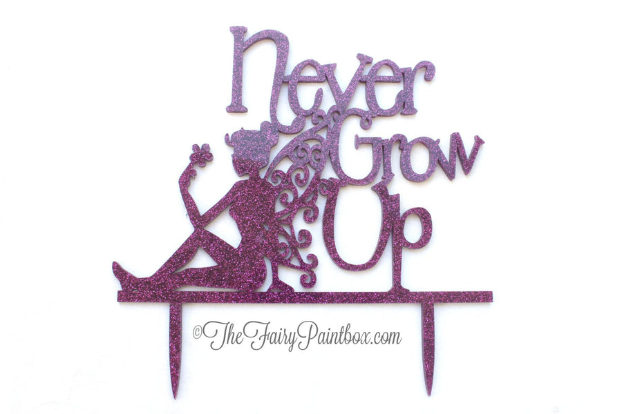 Purple Glitter Fairy Cake Topper, Never Grow Up Cake Decoration, Peter Pan Party Cake Topper, Fairy Birthday Centerpiece, Fairy Party Decor features 1/8'' thick laser-cut purple glitter plastic with seated fairy alongside "Never Grow Up" text. Inspired by Peter Pan's "Never Grow Up" motto, this gorgeous fairy cake topper is perfect for any event. Use our Never Grow Up Fairy Cake Topper for a Peter Pan Birthday cake topper, Fairy Birthday cake topper, Tinkerbell birthday cake topper, Fairy Tale wedding cake topper and so much more.