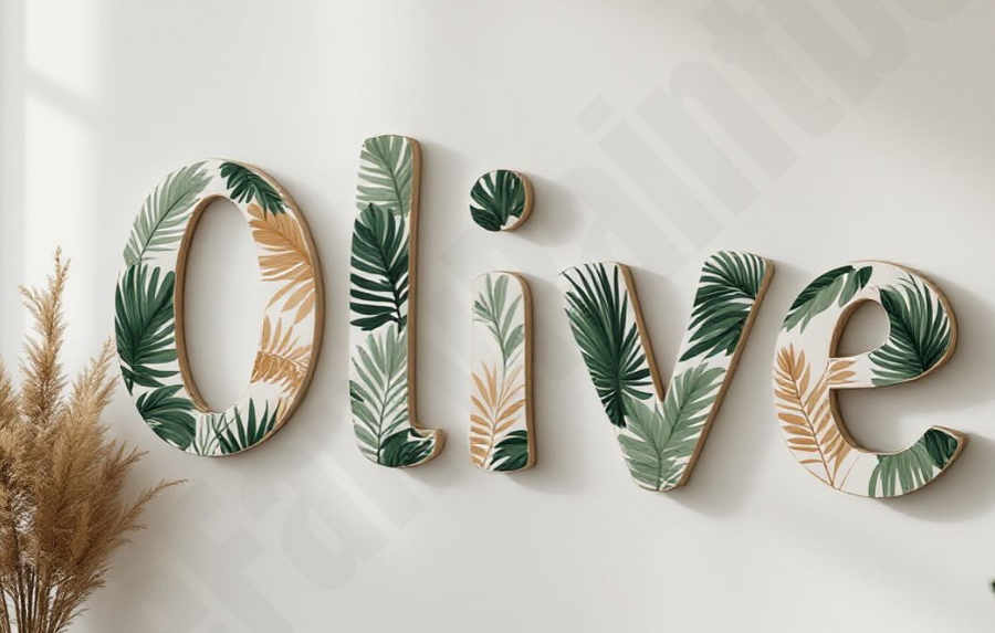 Infuse your baby's nursery with a vibrant touch of nature! Our hand-painted palm leaf wood wall letters are the perfect decorative accent for any gender-neutral baby room. Each letter is meticulously crafted, showcasing the lush greens and enchanting details of tropical palm leaves, bringing a sense of tranquility and warmth to your child’s space.