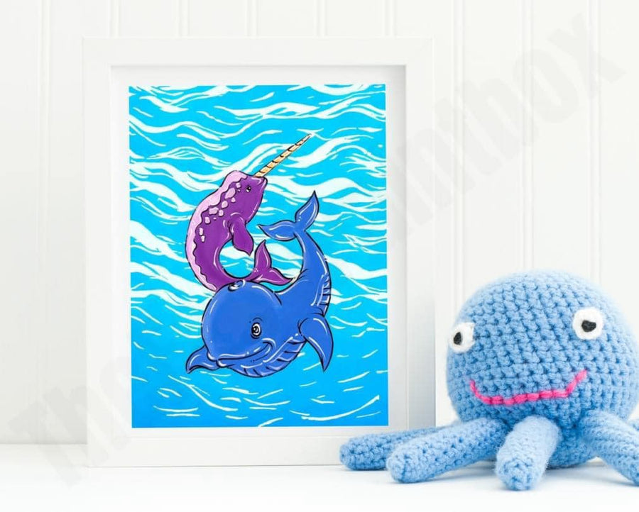 Dive into the magical world of the ocean with this vibrant and playful acrylic print, showcasing a charming blue whale and a whimsical purple Narwhal frolicking in the deep blue sea. Printed on high-quality poster paper, this unique piece is perfect for adding a pop of color and nautical whimsy to any ocean-themed nursery room wall.