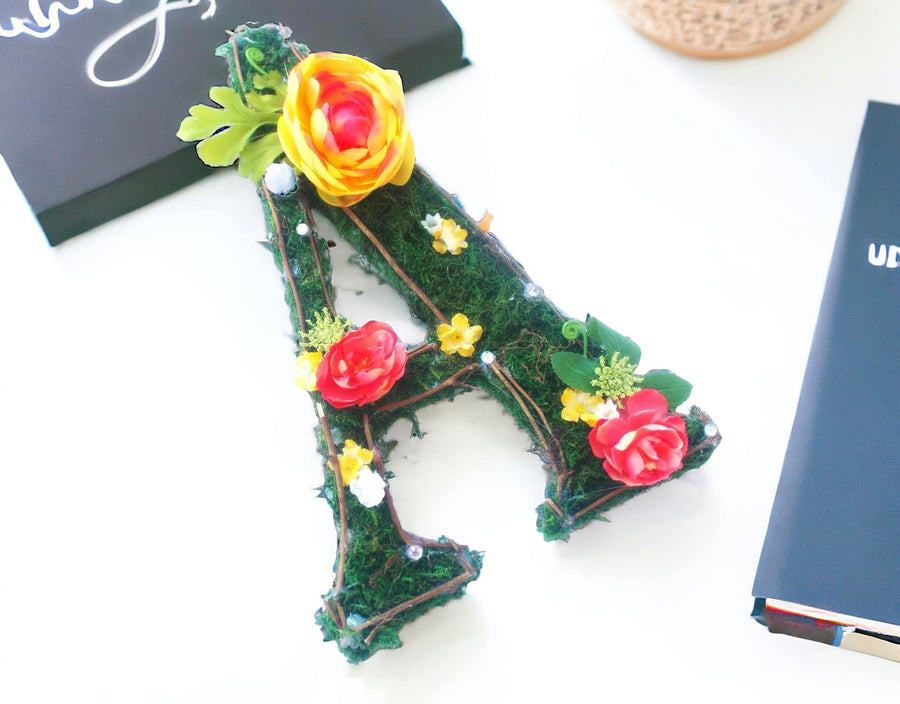 - wooden letter or number base covered in gorgeous green preserved moss, elegant coral pink rose buds, yellow roses with mini white blooms, twig borders, dew drop gems, etc.