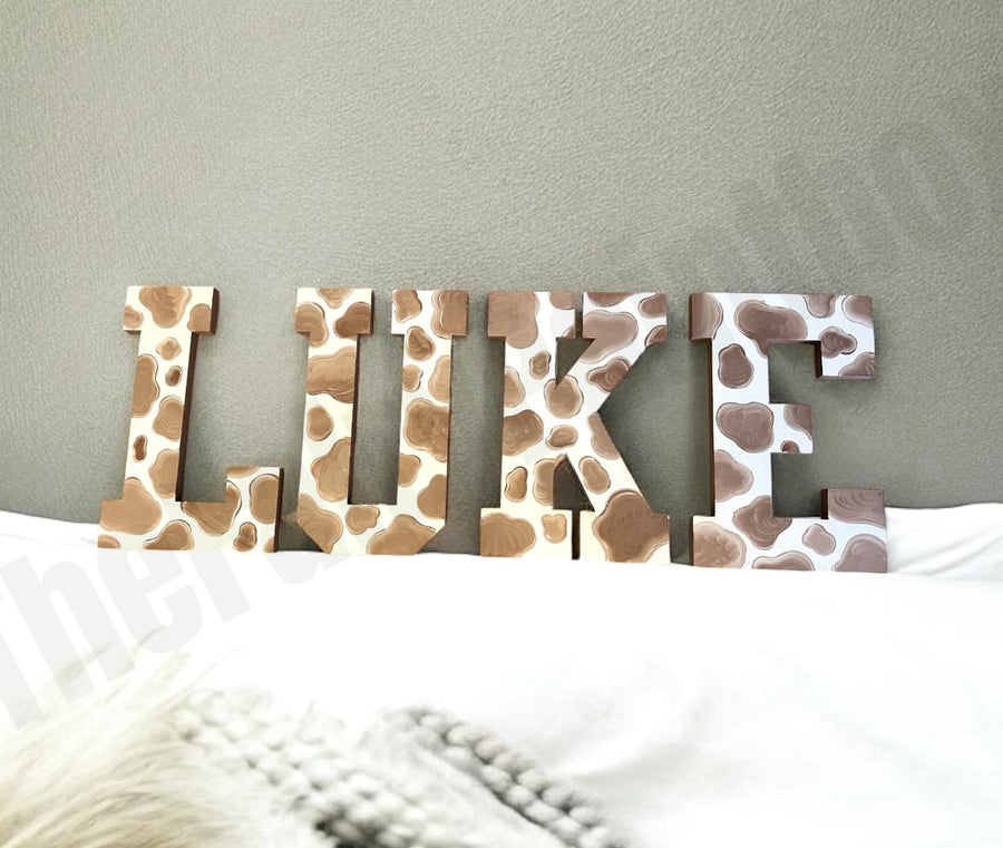 Our hand-painted brown cow print wooden letters are perfect for your little one's haven! Each letter is thoughtfully crafted to spell out your baby's name, adding a rustic yet playful touch that perfectly complements the cozy atmosphere of a baby’s room. Each letter features a whimsical brown cow print motif, meticulously painted by hand over a background of pristine white wood. This unique design brings the spirit of a cozy farmhouse right into your child's space, making it ideal for any nursery theme from natural organic, rustic cottage to farm themed rooms.