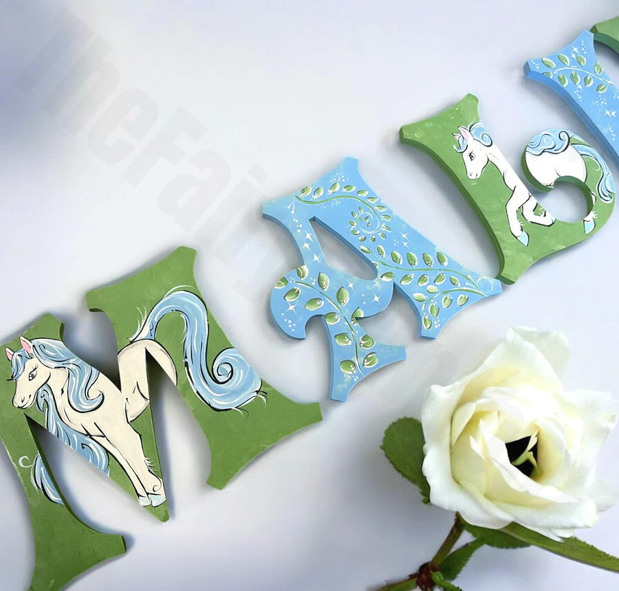Transform your little one's nursery into a whimsical haven with our enchanting hand-painted Magical Horses Nursery Decor! Each wooden wall letter is a unique masterpiece, echoing the nostalgic charm of 70s and 80s animated children's fantasy films, where vibrant colors and enchanting creatures come to life. Delicately adorned with detailed, swirling vines that dance across every other letter, these pieces are not just decor—they're portals to a dream world! The soft, soothing color schemes of blue and green intertwine to create a serene atmosphere, perfect for sparking your child's imagination and whisking them away on magical adventures.