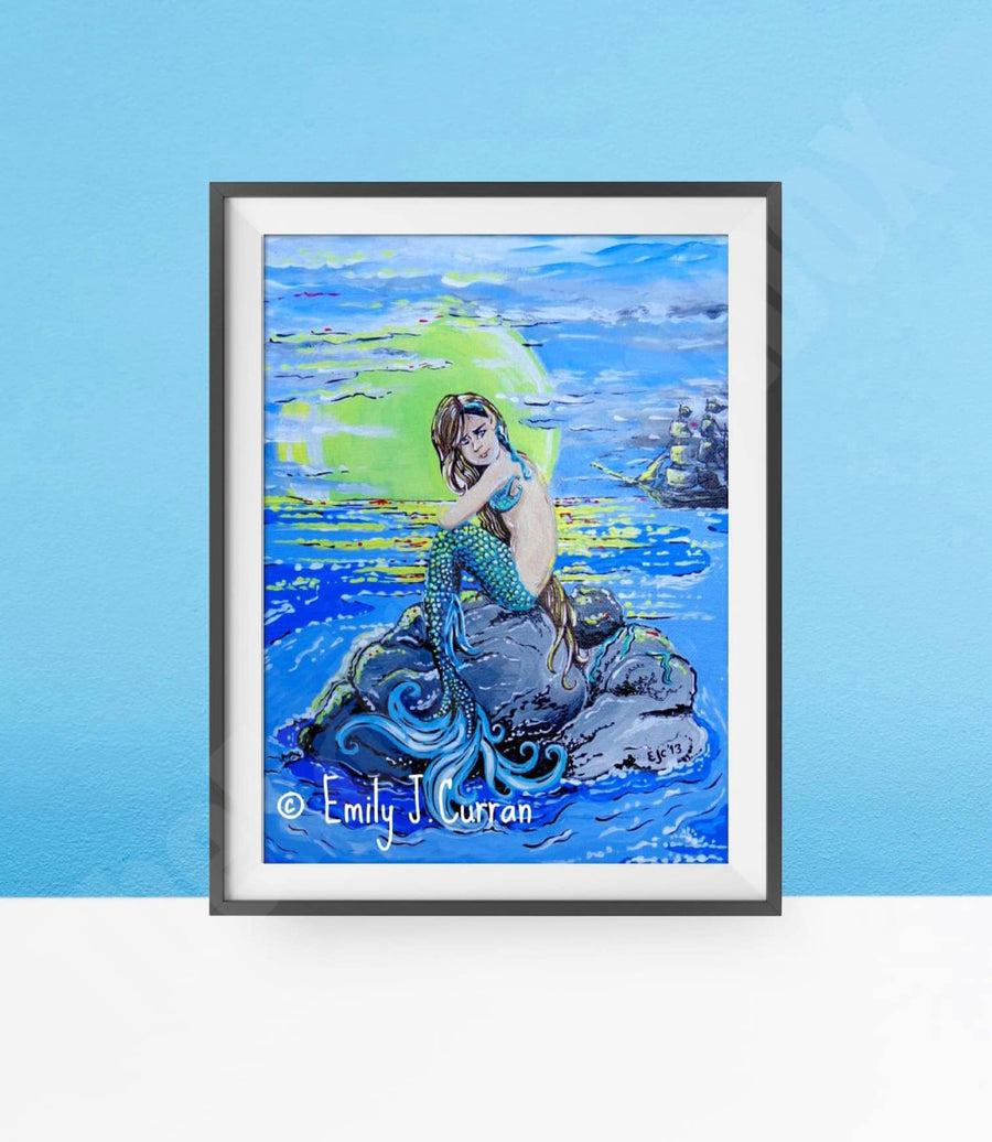 Our captivating moonlit mermaid Giclee nursery room print celebrates the enchanting beauty of mermaids. This reproduction of an original acrylic painting captures the mysterious allure of these mythical creatures at night. The artwork showcases a thoughtful mermaid gracefully perched on top of a rock; her gaze tilted backward as an ominous ship enters the horizon.