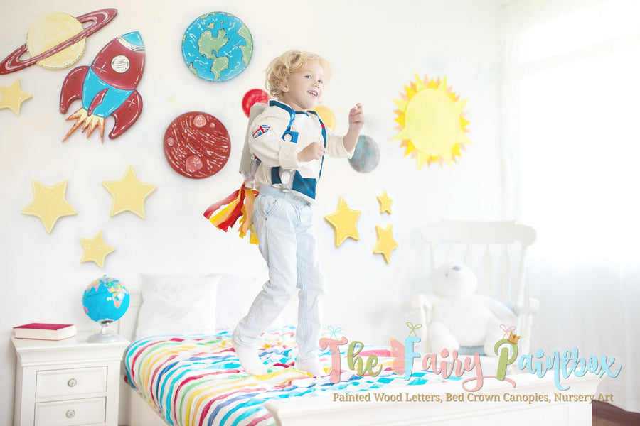 - hand painted solar system, outer space, astronaut kids room wall decor shapes