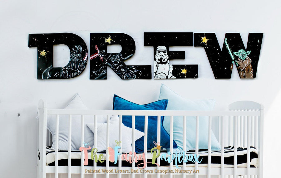 Hand-Painted Craftsmanship: Each wood letter features a hand painted spaceship or droid character over a black galaxy backdrop.