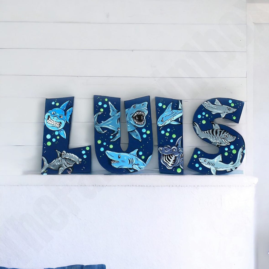 Hand-Painted Craftsmanship: Adorable and joyful sharks painted across baby's name letters in navy blue. Sharks of all different species!
