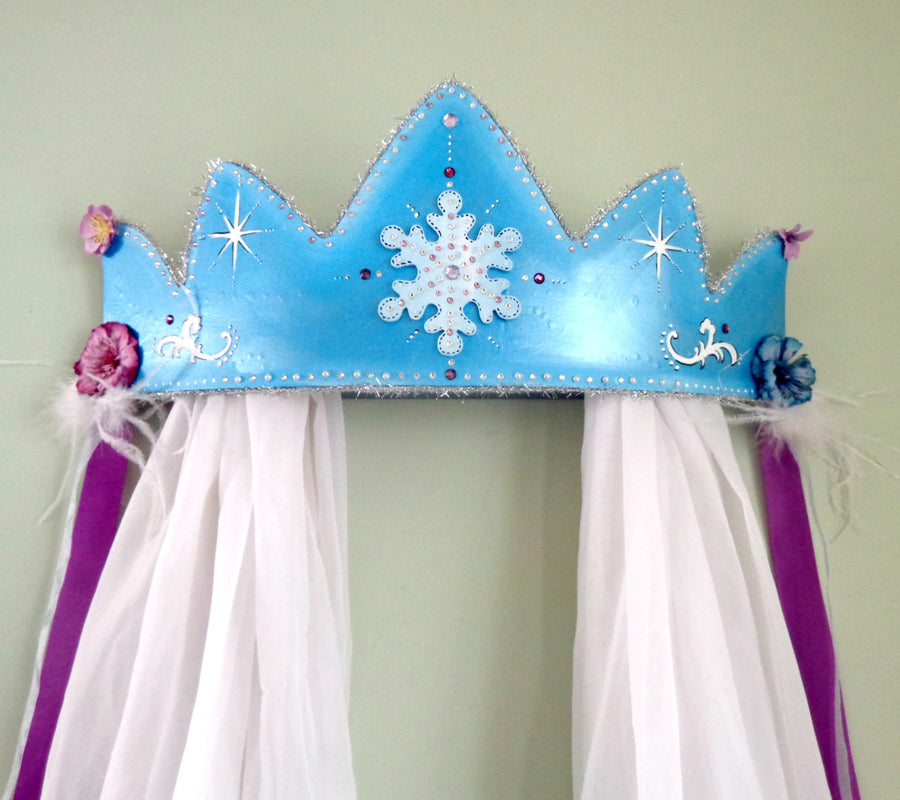 Snow Queen Bed Crown Canopy, Winter Princess Crown Canopy features a 3-D crown that sits out from the wall, painted in pearl blue with a centered white snowflake, hand painted winter swirl accents and shimmering Swarovski crystals. Each end of the crown canopy is adorned with sheer and satin hanging ribbons, silk flowers and white snow bursts. Snow Queen Bed Crown Canopy is accented with silver tinsel trim, crystals, white pearl beads along the top and bottom edges of crown and snowflake art. Glittering white tulle is included and draped over the inner hidden dowel. Tulle curtains measure about six feet long on either side, perfect for draping on either side of a bed, headboard or window.