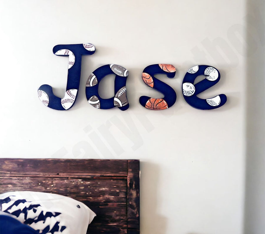 Sports Ball Collage Painted Wood Letters, the perfect addition to any baseball-themed or sports themed baby room or sports nursery decor! These handcrafted letters are each intricately painted with vibrant colors and playful designs, making them a fun and personalized touch for your little athlete's space. Whether used to spell out a name, a favorite sports team, or just to add a touch of sporty charm to the room, these letters are sure to make a bold statement.