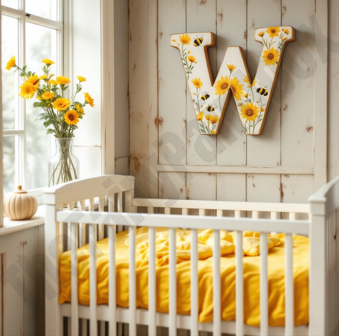 Our bee-autiful Bumblebee Floral Painted Wooden Wall Letters spell out baby's name or monogram letter on the wall. These personalized keepsake signs are not only a joyful addition to any nursery or bedroom but also a unique way to celebrate your child's identity. The lovely painted yellow petals and stems with bees buzzing across baby's monogram wall letters is sure to become a treasured centerpiece in your child's room.