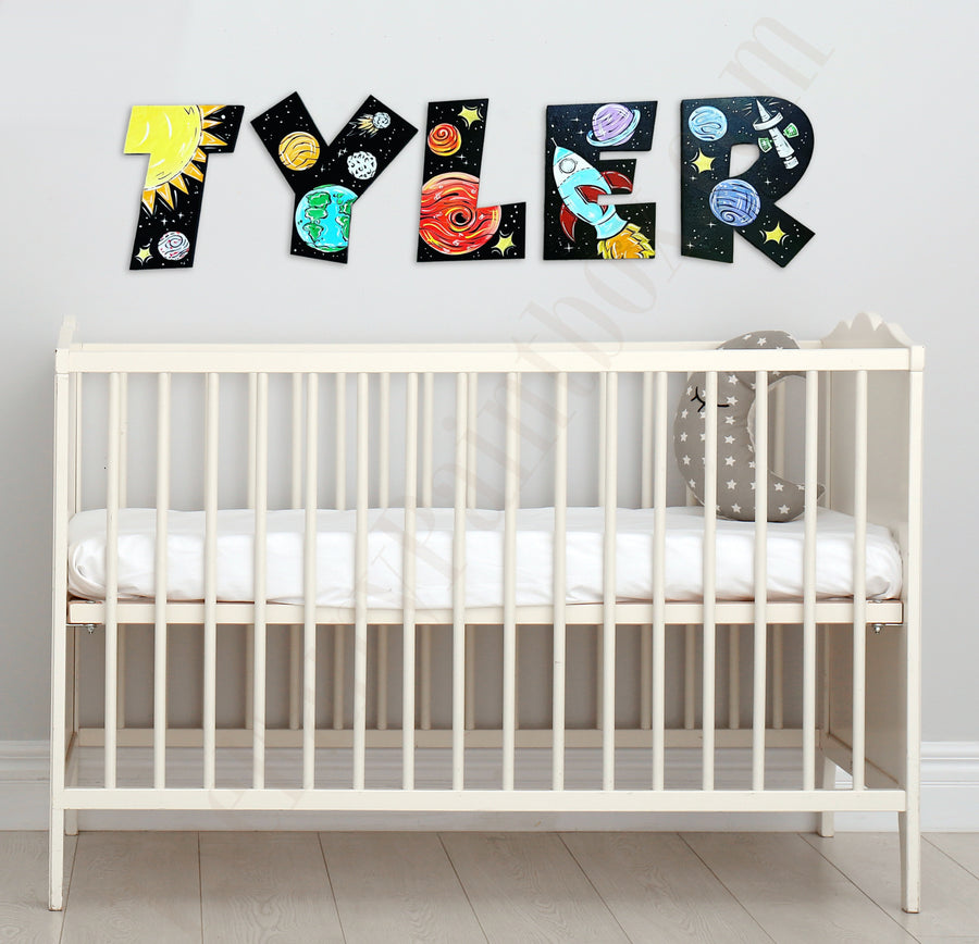 - hand painted wooden letters in black cosmic space scenes
