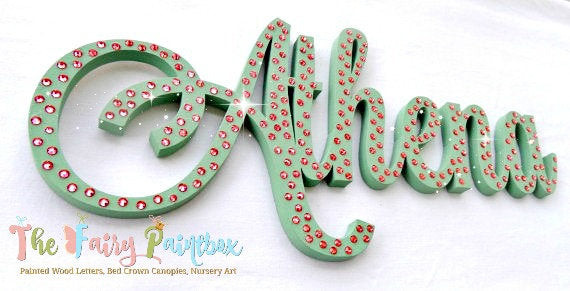 Crystal Script Baby Name Sign - Sparkle Pink Connected Wood Letter Sign - Painted Wood Letters - Girls Nursery Room Decor - Wall Letters feature sage green painted script wood letters, with gorgeous shimmering swarovski crystals across each letter. Every crystal is applied by hand and gives off a shimmer in light like no other crystal product. Letters come as a connected script sign. Wood letters are made from solid Baltic Birch at 1/2'' thick, triple-varnished. Use our Crystal Script Baby Name Sign - Sparkle Pink Connected Wood Letter Sign - Painted Wood Letters - Girls Nursery Room Decor - Wall Letters to spell your child's name on the wall of a princess nursery, fairy tale nursery, display a special letter or word at your Baby Shower or use connected letter sign as a newborn, child or super sparkly wedding letter photo prop or sparkly wedding letter decor.