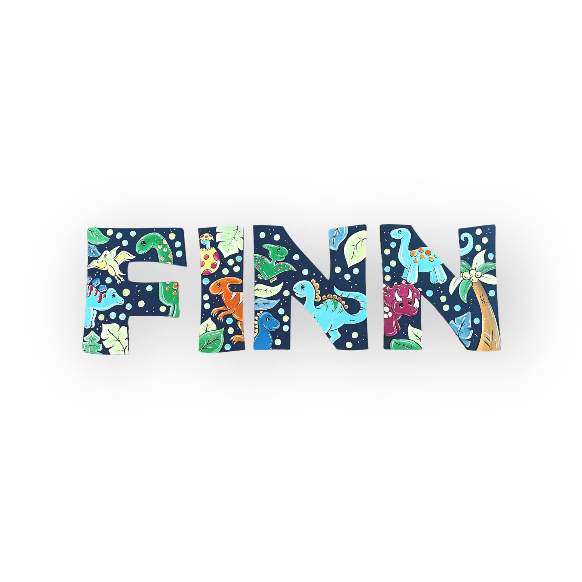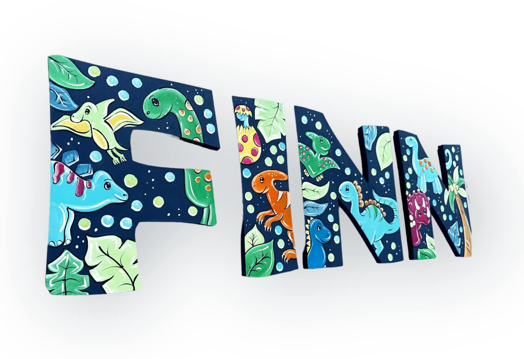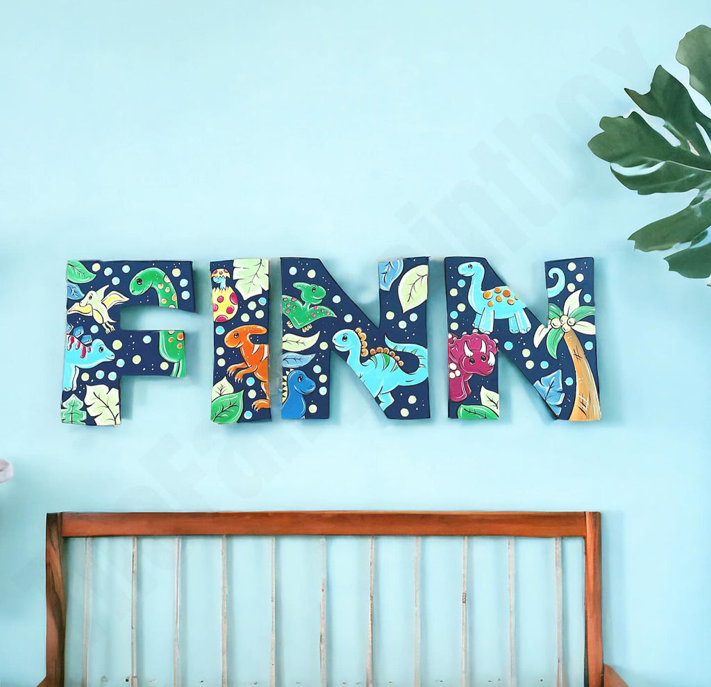 Transport your little one to a prehistoric paradise with our Cute Dinosaur Nursery Decor Painted Wood Letters. Custom crafted to spell out your child's name, these Jurassic wall letters bring a whimsical touch to any nursery or playroom. Each letter is lovingly painted with vibrant colors over navy blue and adorned with charming dinosaurs, creating a truly unique and enchanting display. Whether your little explorer dreams of stomping through the jungle or soaring through the skies, these striking letters will be a Jurassic centerpiece for years to come. Spark your child's imagination and add a touch of enchantment to their space with these one-of-a-kind wall letters.