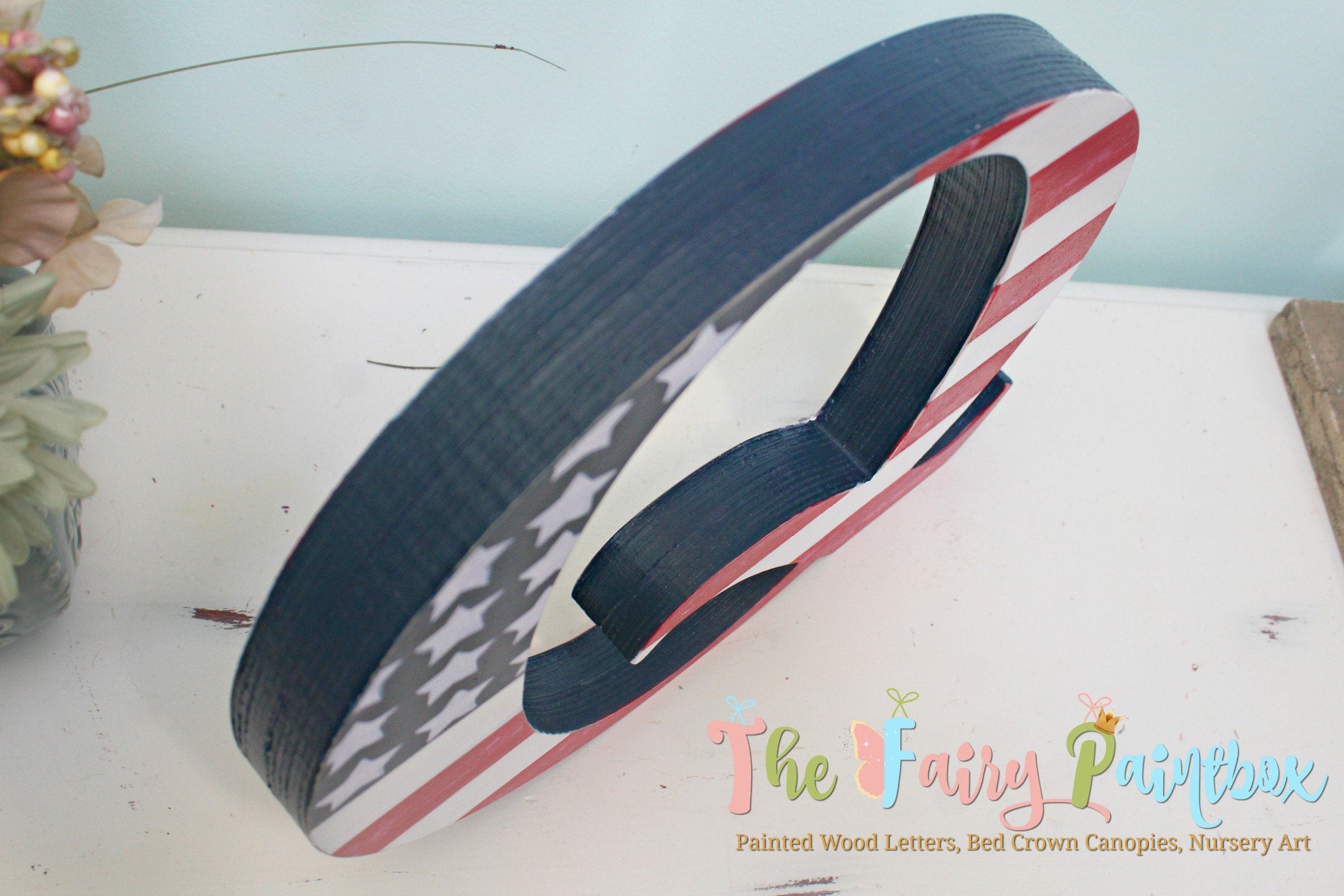 Distressed American Flag Standing Tabletop Letter - Patriotic Nursery Room Decor Letter - USA Flag Centerpiece Monogram - Standing Monogram Letters are made from solid Baltic Birch at 3/4'' thick, triple-varnished. Use our Distressed American Flag Nursery Letters to show your American pride in the entryway, on a tabletop, used as a patriotic centerpiece and so much more.