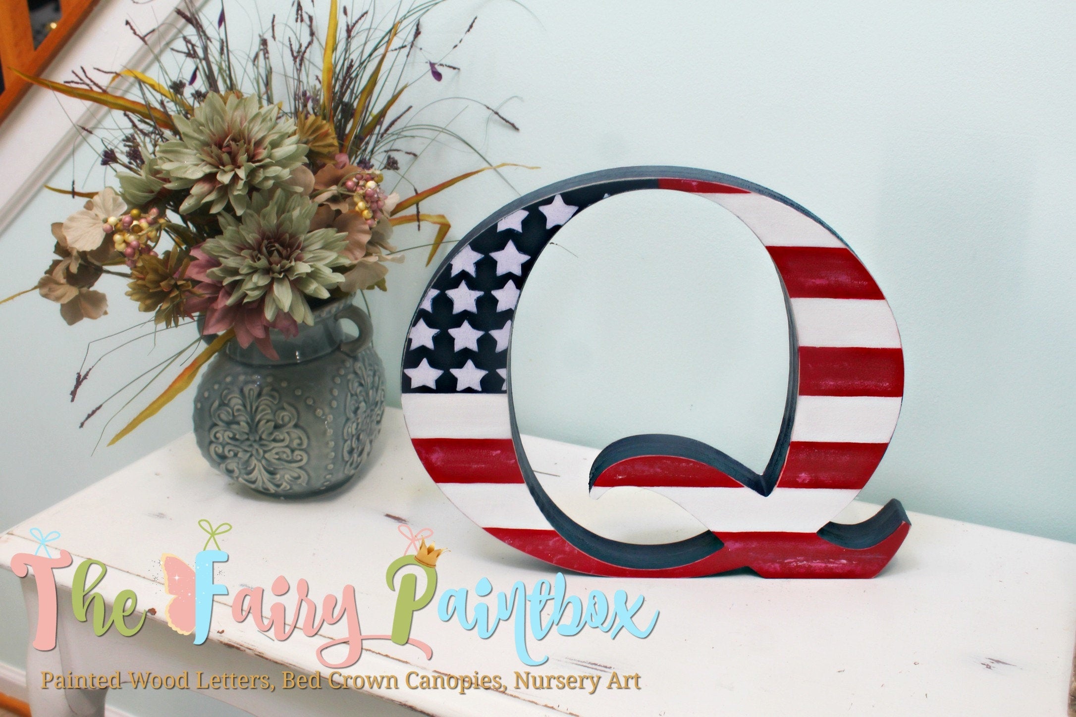 Distressed American Flag Painted Letters are perfect for a Red White Blue Nursery, Patriotic Nursery, Red White Blue Kids Room, Red White Blue Birthday, Patriotic Birthday, Patriotic Personalized Birthday Centerpiece, American Flag Bedroom Accent, American Flag Office Décor or Patriotic Front Door Monogram.