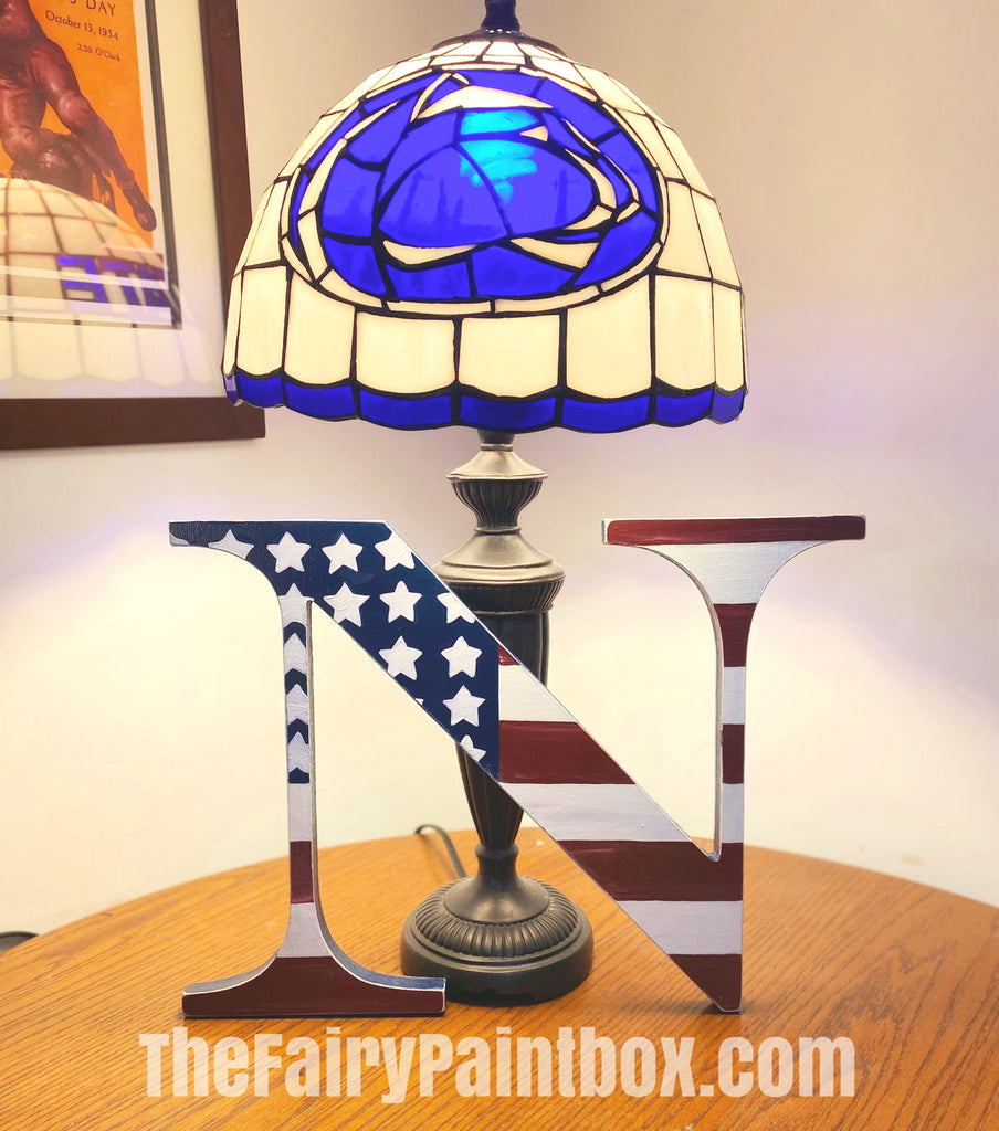 - hand painted navy blue, red and white distressed American flag artwork across FRONT and BACK of monogram letter.