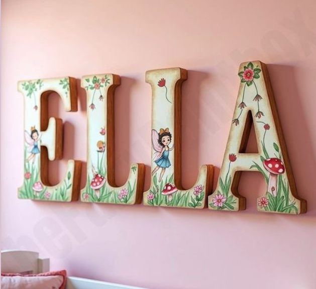 Painted Wall Letters are a must have for your child's room. We provide free preliminary sketches and work with you via email to finalize a design that you love. We will customize any name, phrase or text to coordinate with bedding sets, room themes, color schemes, etc. Choose from our huge selection of fonts and sizes to create your perfect personalized wall letters for any space. Just message us for a custom order!