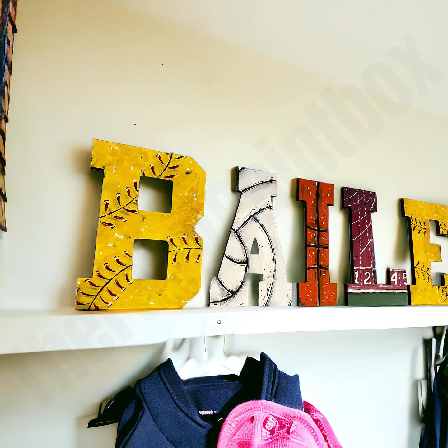 Enhance your daughter's sports room with our Vintage Sports Painted Wood Letters. These charming letters showcase softball, volleyball, track and field, and basketball elements on varsity font wooden letters, adding a touch of vintage sports charm. Transform your daughter's sports room into a stylish and inspiring space with these one-of-a-kind letters.