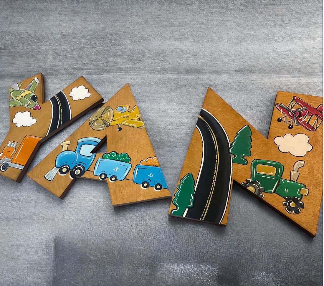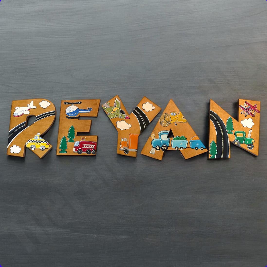 Each letter is expertly designed and features delightful painted vehicles that captivate young minds. With colorful depictions of airplanes—including helicopters, jets, crop dusters—as well as charming land vehicles such as cabs, firetrucks, and police cars, these letters not only spell out your child's name but also ignite their imagination and love for adventure!