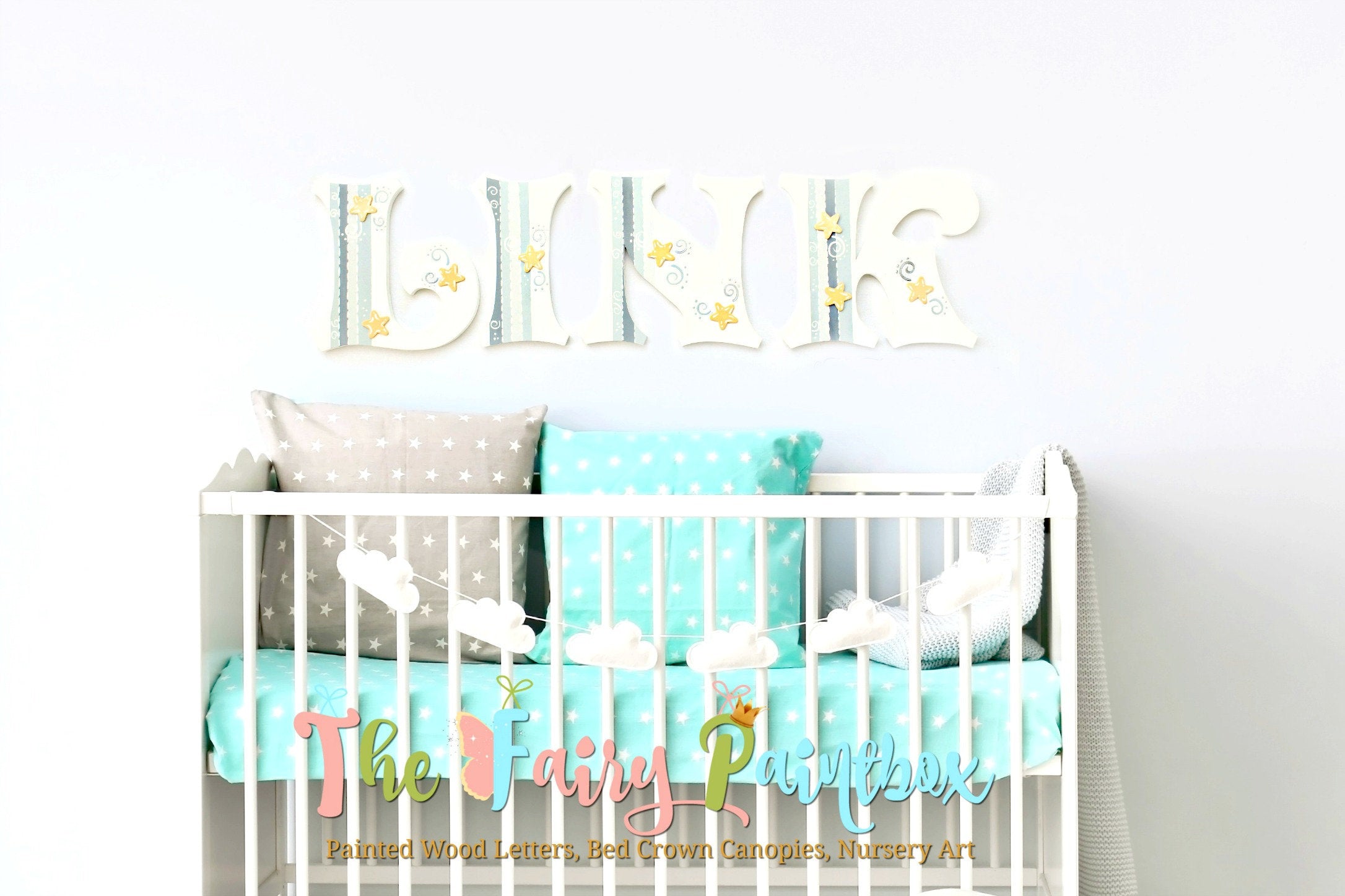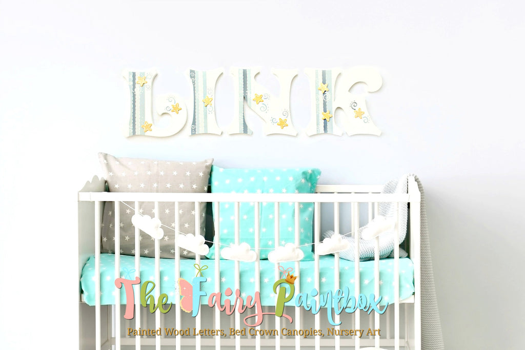 Twinkle Star Nursery Wall Painted Letters for Baby Room Wall - Twinkle Star Bedding Crib Decor Letters - Baby Room Stars for Wall Letters - Twinkle Star Bedding Decor Baby Name Sign - Twinkle Star Kids Wall Letters make the perfect personalized decor name sign for displaying a baby name on the nursery wall of a Twinkle Star nursery, hanging above Twinkle Star bedding set crib as name decor, spelling a special word or name for a twinkle star baby shower centerpiece and so much more.