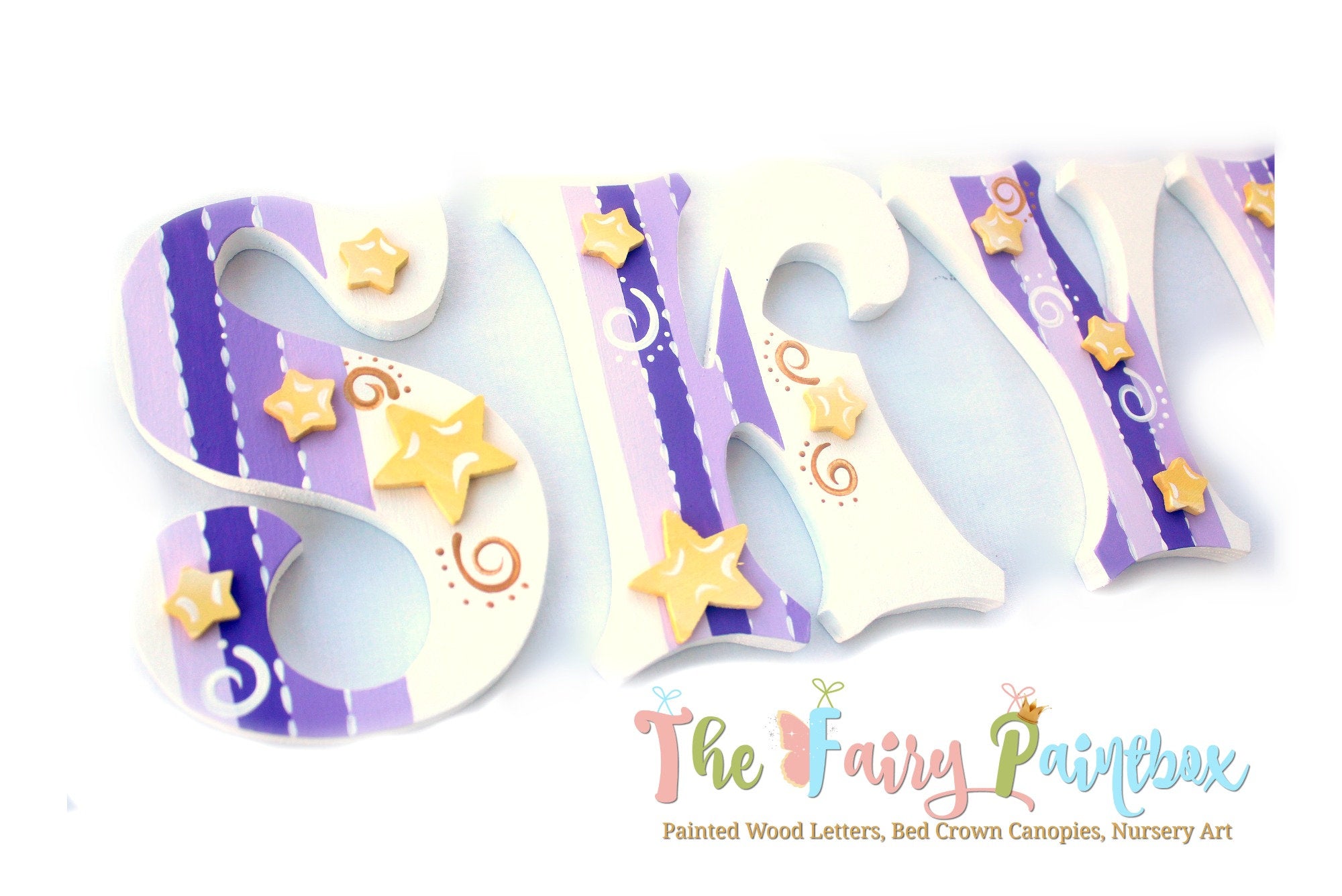 - hand painted white/gray wooden letters with yellow stars and silver swirl elements OR also available in purple/white/gold scheme (custom colors welcome)