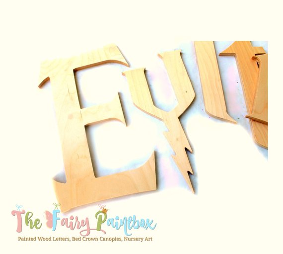 Unfinished Wizard Wooden Letters in our magical lightning font are perfectly personalized for your next craft project and are easy to paint or stain. Decorative wooden letters are great for personalizing baby's nursery room wall, decorating toy boxes and furniture or displaying for special events like baby showers and weddings.